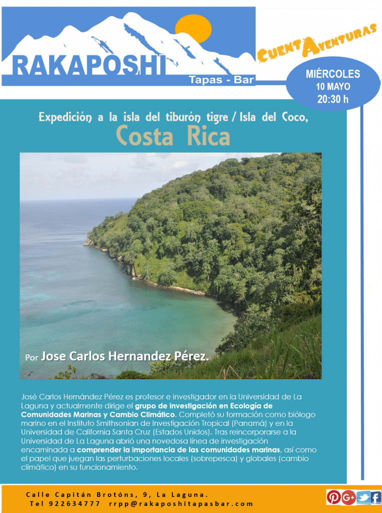 Charla Cuentaventuras. 10 mayo 2017.Expedición a la isla del tiburón tigre/Isla de Coco en Costa Rica. Jose Carlos Hernandez